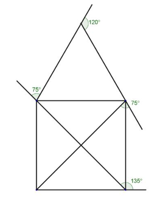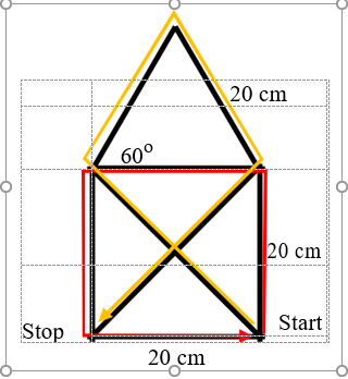 A piros színű útvonalról (lásd ábra) áttérünk a sárga útvonalra. A négyzet bejárása után, a robotnak fordulnia kell 135 fokot. A robot aktuális iránya és az új haladási irány között éppen 135 fokos fordulóra van szükség (90o + 45o). Ezután Pithagoras tételével kiszámíthatjuk a 20 cm oldalhosszú négyet átlójának hosszát: