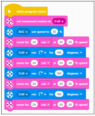 20 cm lépésenként magyarázzuk. A bejárás útvonalát szemlélteti az alábbi ábra. Először a piros színű útvonalon haladunk végig. Tehát egy négyzetet ír le a robot mozgás közben. Ennek a kódja pl.: