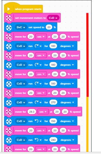 A teljes kód a fenti ábrán látható (az ábra melletti jelölés a piros és sárga útvonalrészt jelenti). Természetesen a kód egyszerűsíthető, de már a motorok használatával is megoldhatók komplexebb feladat.