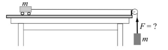 Indoklás: A függőleges lógó tömeg statikus esetben mg-t feszítene, de a rendszer gyorsul, a függőleges fonálban lévő erő kisebb lesz mint mg, tehát F < mg.