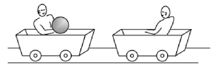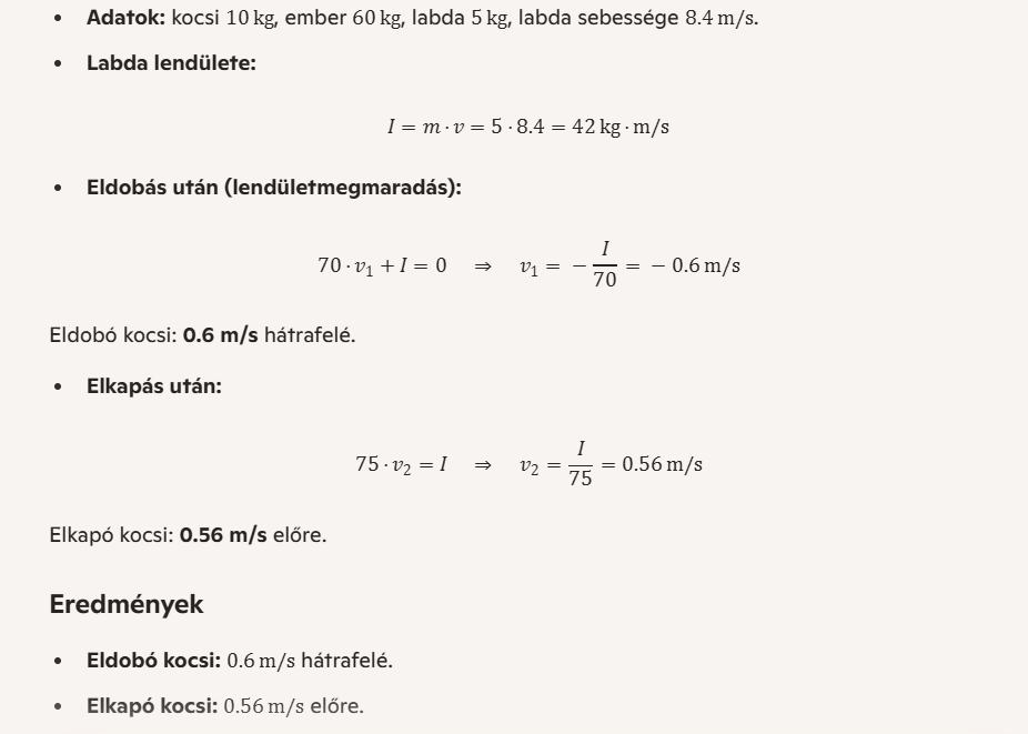 1. Két 10 kg-os kiskocsiban egy-egy 60 kg-os ember ül. Az egyik kocsiban van egy 5 kg-os medicinlabda, amit 8,4 m/s sebességgel átdob a másik embernek.