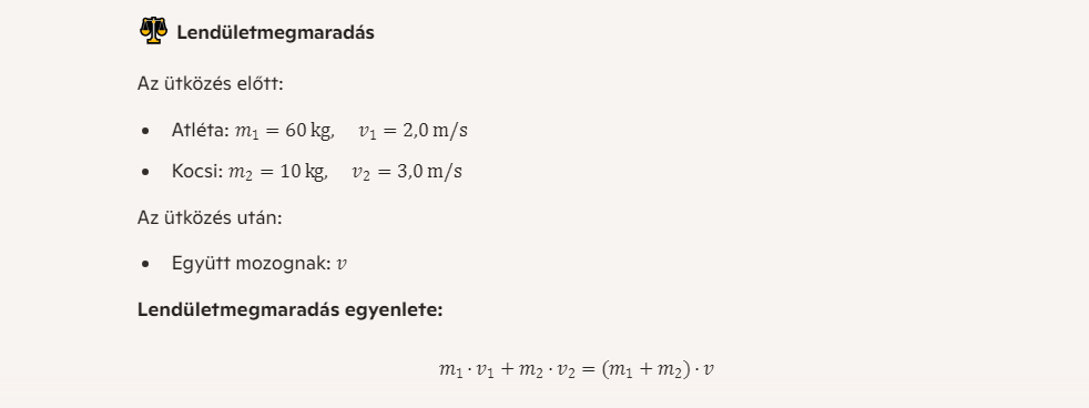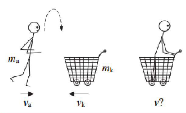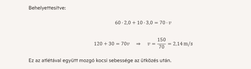 2. Egy 60 kg-os atléta 7,2 km/h sebességgel fut. Felé löknek egy 10 kg1-os bevásárlókocsit 10,8 km/h sebességgel. Az atléta felugrik, és a kocsiban landol, miközben megtartja vízszintes sebességét.
