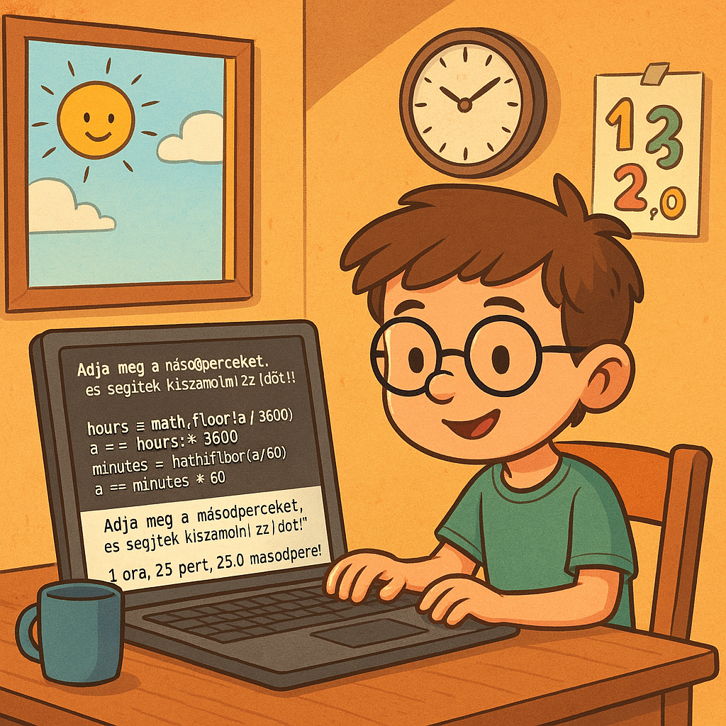 Egyszer volt, hol nem volt, egy okos kisfiú, Dávid, aki imádott számítógépekkel dolgozni. Minden reggel a szobájában ült, és programozott, hogy megoldja a legnagyobb rejtélyeket. Egy nap egy különös feladatot kapott: egy varázslatos időmérő kódot kellett írnia, hogy kiszámolja, hány óra, perc és másodperc van egy adott másodpercösszegben.