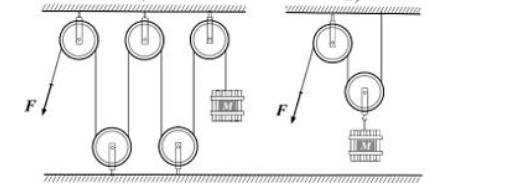 105. Kétféle csigarendszer M tömegű terhet kétféle csigarendszerrel emelünk. Melyiknél kell kisebb F erő?
