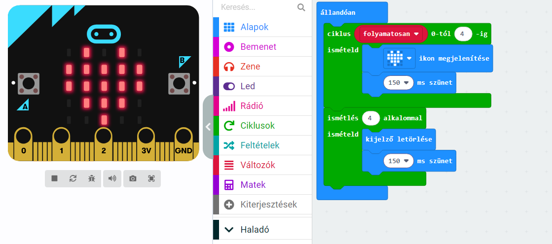 - Az ismételd ciklus végigmegy az x koordinátákon, így a LED-ek sorban aktiválódnak a kijelző felső sorában.