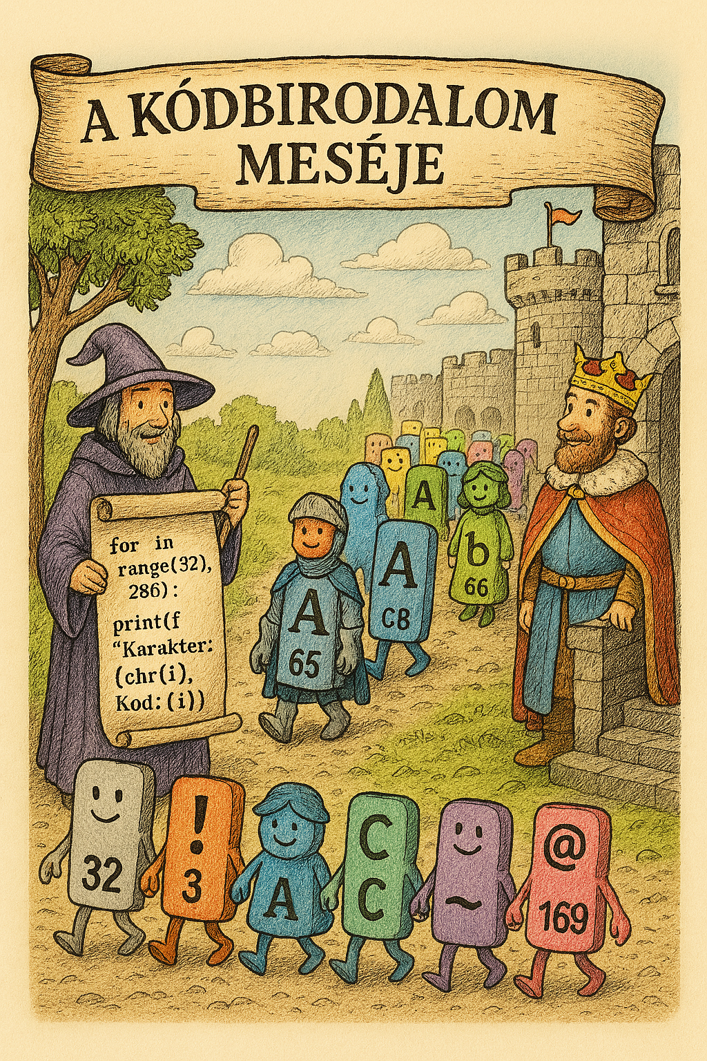 Egyszer volt, hol nem volt, volt egyszer egy hatalmas, csillogó számítógépbirodalom, ahol a betűk, számok és jelek mind együtt éltek. De volt egy nagy gond! Minden királyságban más nyelvet beszéltek, így a betűk és számok nem értették egymást, amikor egyik számítógépből a másikba akartak utazni.