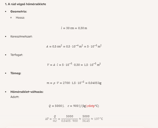 Egy alumíniumból készült rúd 30 cm hosszú, keresztmetszete 0,5 cm². A rúd kezdeti hőmérséklete 18 °C, és 5 kJ hőenergiát közlünk vele.