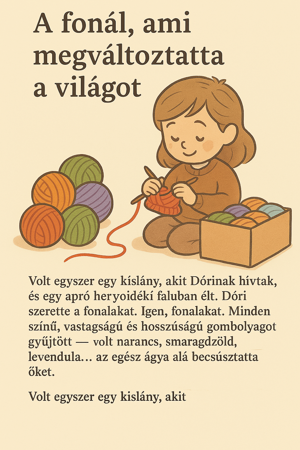 Volt egyszer egy kisfiú, akit Dórinak hívtak, és egy apró hegyvidéki faluban élt. Dóri szerette a fonalakat. Igen, fonalakat. Minden színű, vastagságú és hosszúságú gombolyagot gyűjtött — volt narancs, smaragdzöld, levendula... az egész ágya alá becsúsztatta őket.