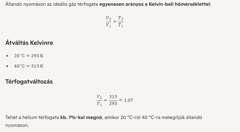 20 °C-os héliumot állandó nyomáson 40 °C-ra melegítünk. Hogyan változik a térfogata?
