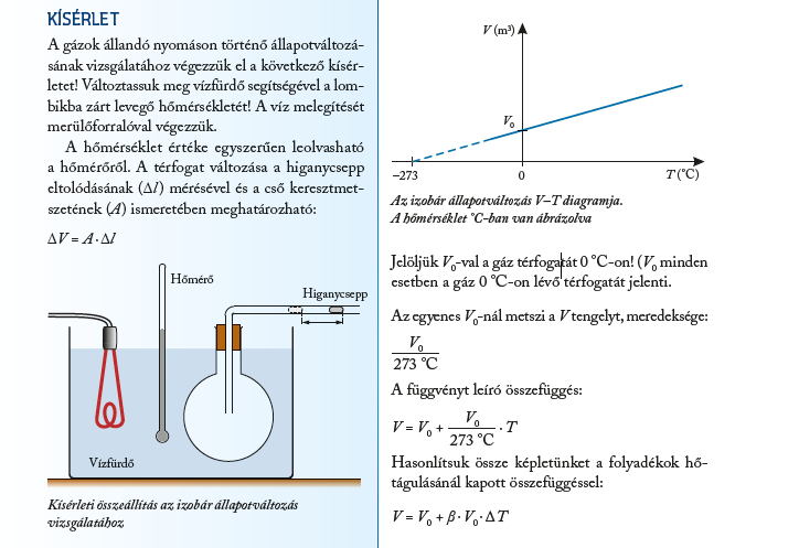 Jelenség: A nyomás állandó, az állandó tömegű gázok térfogata és kelvinben mért hőmérséklete között egyenes arányosság van.