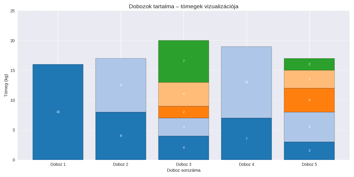 - aktualis_doboz: Egy változó, amely az éppen csomagolt doboz össztömegét tartja nyilván.